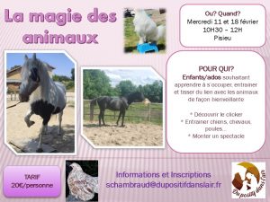 Enfin l’offre « pension travail » est à la dernière raison de notre venue chez Sandrine. Cela nous permet à Iota et moi d’en apprendre plus sur le clicker training et de voir ou revoir des exercices en utilisant le renforcement positif. Chaque cours que nous avons eu jusqu’à présent m’a permis d’acquérir une meilleure technique et de plus grandes connaissances de cette méthode d’éducation animale.